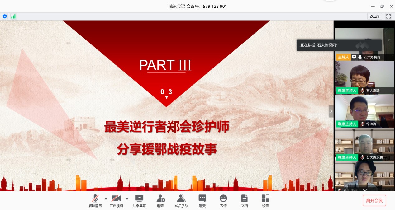 (通讯员:黄兰华 周汶昊)为学习贯彻习近平总书记关于疫情防控工作的系列重要讲话和指示批示精神,认真贯彻落实习近平总书记给北京大学援鄂医疗队全体“90后”党员的回信精神,5月2日晚19:30,必赢nn699net官网(武汉)自动化类专业23Z192班与中国石油大学(华东)地质类1901班“云”端相聚,联合开展以“绽放战疫青春,坚定制度自信”为主题的线上团会。本次团会出席的嘉宾有必赢nn699net官网(武汉)必赢nn699net官网党委副书记何建新,团委副书记许彦,2019级辅导员黄兰华,中国石油大学(华东)地球科学与技术学院党委副书记徐永涛,团委书记霍宁宁,团委副书记姜永昶,地质类1901班主任袁静教授,山东大学齐鲁医院内分泌科护士长郑会珍。本次主题团会坚定青年学生制度自信,激励学生练就过硬本领,投身强国伟业,始终保持艰苦奋斗的前进姿态,在实现中华民族伟大复兴中国梦的新长征路上奋勇搏击。
