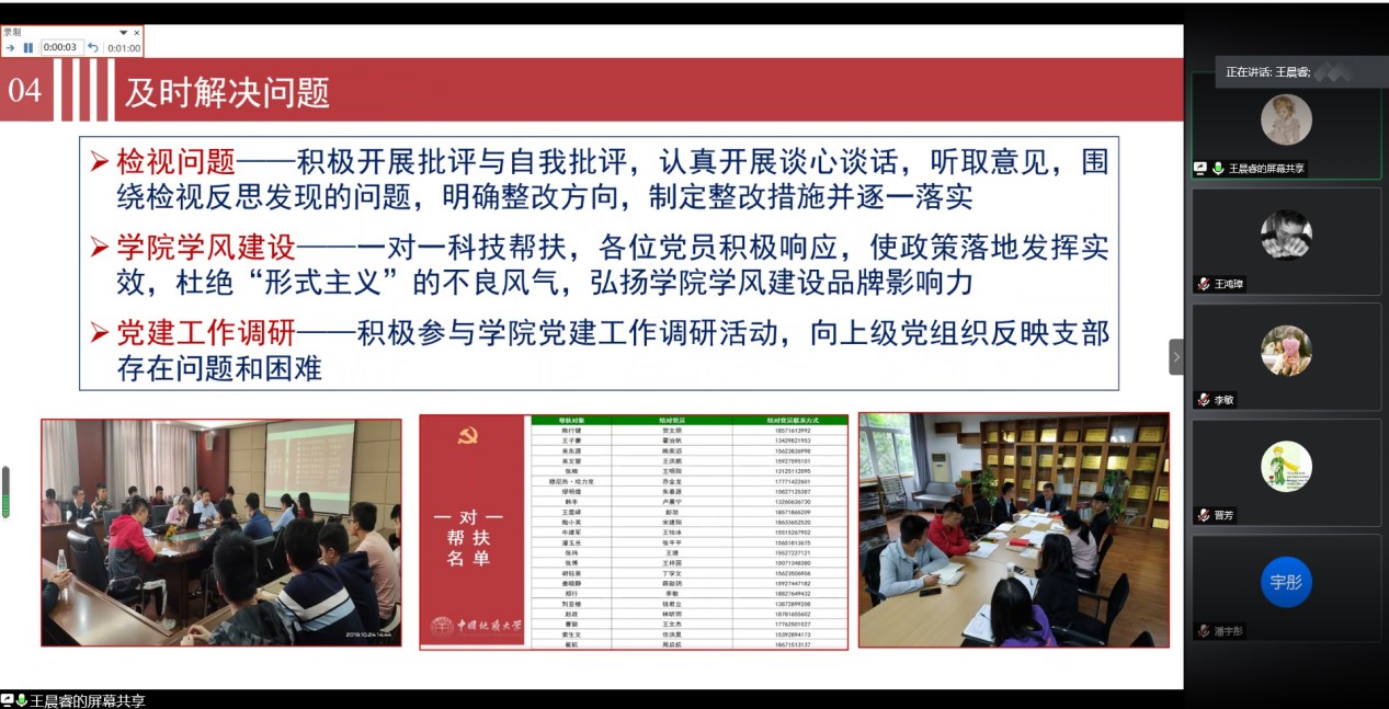 博士生党支部深入开展“不忘初心,牢记使命”主题教育,推进“两学一做” 学习教育常态化制度化,积极开展批评与自我批评,认真开展谈心谈话,听取群众意见,围绕检视反思发现的问题,明确整改方向,制定整改措施并逐一落实。支部在加强个人学习的同时多次组织集中学习,各支部成员能够及时发现问题并加以解决。支部成员在学术上严谨认真,取得一系列学术成果。部分支部成员在疫情期间投身抗疫一线,用实际行动诠释了人民有困难,党员冲在前。