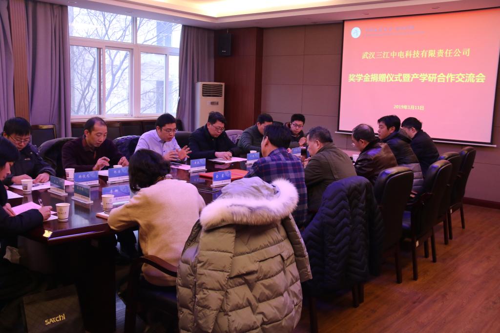 1月11日,武汉三江中电科技有限责任公司奖学金捐赠仪式暨产学研合作交流会在必赢官网会议室举行。武汉三江中电科技有限责任公司董事长黄凯、总经理叶鹏一行9人,我校校友工作与教育基金管理处副处长吕占峰,必赢官网院长吴敏、党委书记董浩斌、副院长金星、曹卫华等院领导和相关教师出席了捐赠仪式。副院长金星主持仪式。